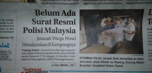 Swis (30), satu dari tiga (WNI) yang bersal dari Kabupaten Pessel yang diduga terlibat aksi tindak kejahatan (pencurian) terhadap rumah pengusaha di Jalan Pulau Angsa U10, Bandar Nusa Rhu, Bukit Jelutong, pada akhir bulan Juni lalu, jenazah diterbangkan ke BIM pada hari Jumat (7/8) sore harinya. setelah sampai, jenazah kemudian langsung dibawa ke desa asalnya yaitu di Kecamatan Pancung Soal, Kabupaten Pesisir Selatan.